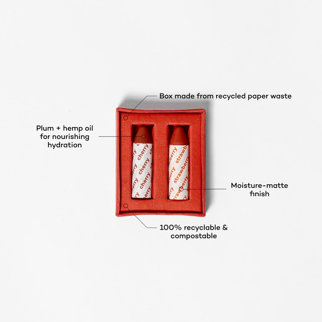 Heads up: This zero waste product appears small because it’s tube-free (i.e. no packaging!) but it’s the standard lipstick size at .12 oz.